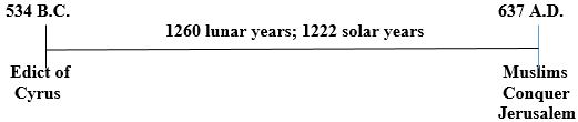 If we calculate 1260 lunar years, the cycle is only 1222.5 solar years. Applying this to Judah and Jerusalem, we see that from the Edict of Cyrus allowing the Judahites to return to Jerusalem in 534 B.C. until Jerusalem was conquered by the Muslims in 637 A.D. was precisely 1222 years (or 1260 lunar years).