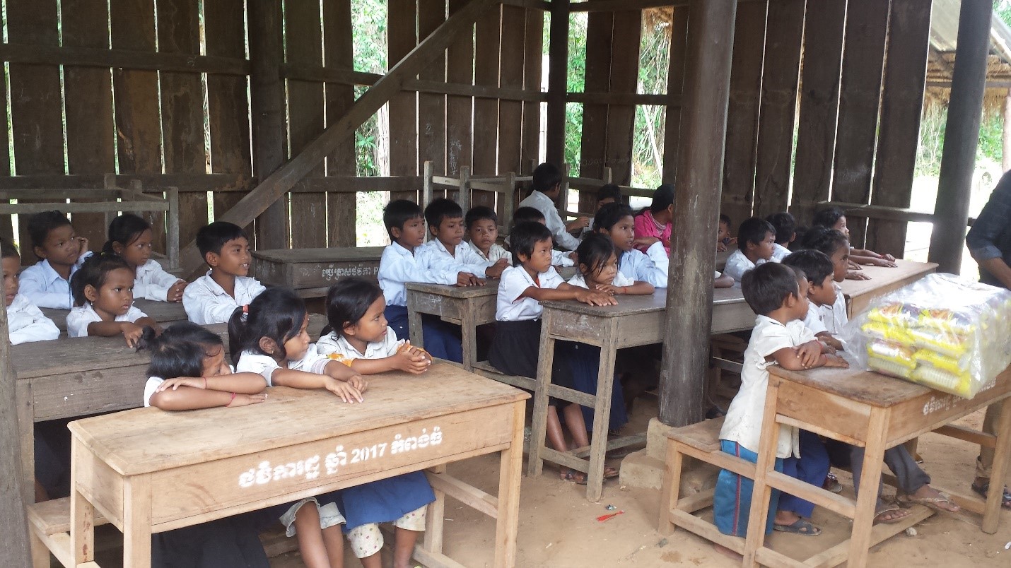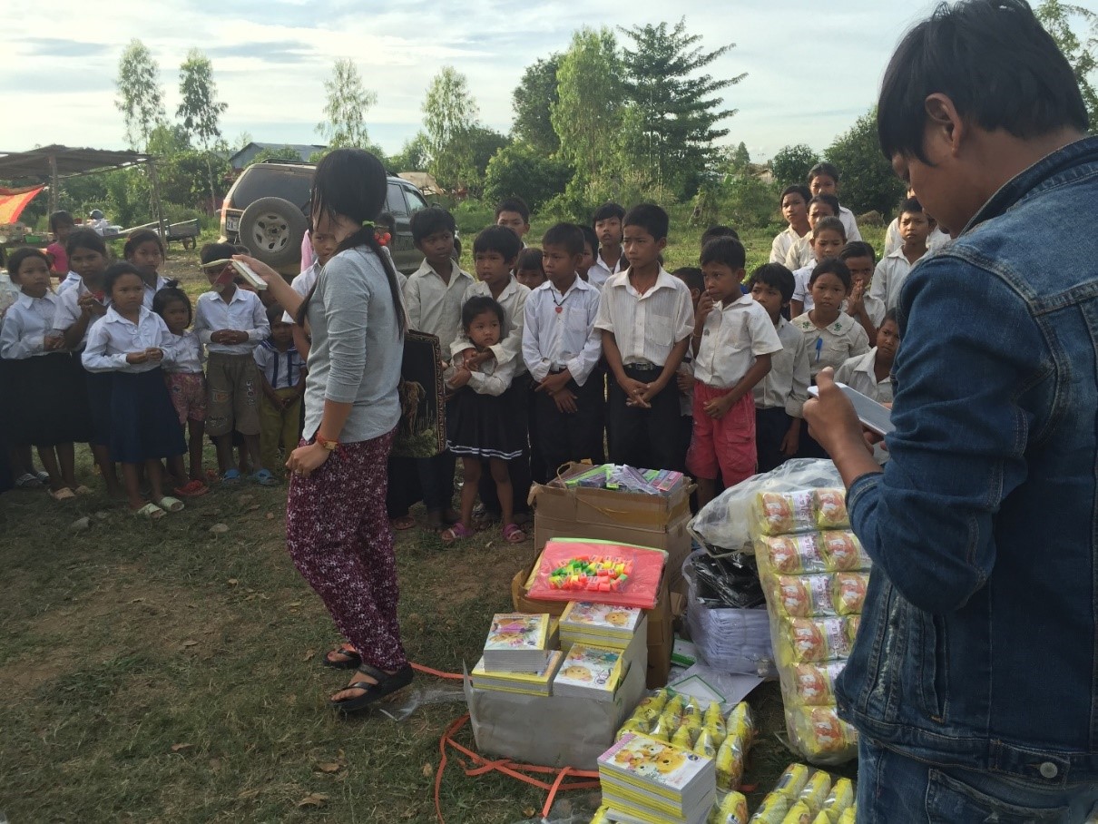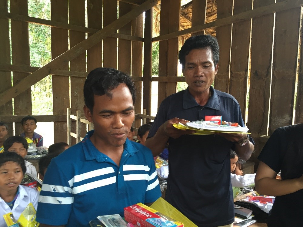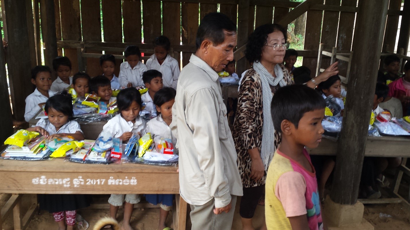 On November 17, 2017, the day after Setra’s engagement ceremony, we loaded up the car and drove about 2 hours to the middle of a rice paddy region to give poor school children some uniforms, books, folders, and even a snack package. The little community stood at a dirt crossroad, and the school consisted mostly of children whose parents had abandoned them to find work in Thailand. The local policeman was taking care of them to make sure they got to school each day.