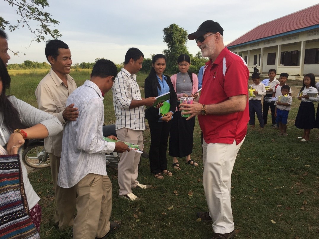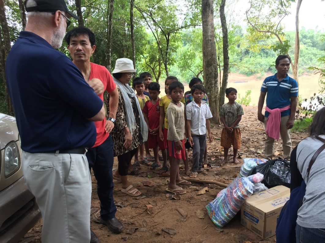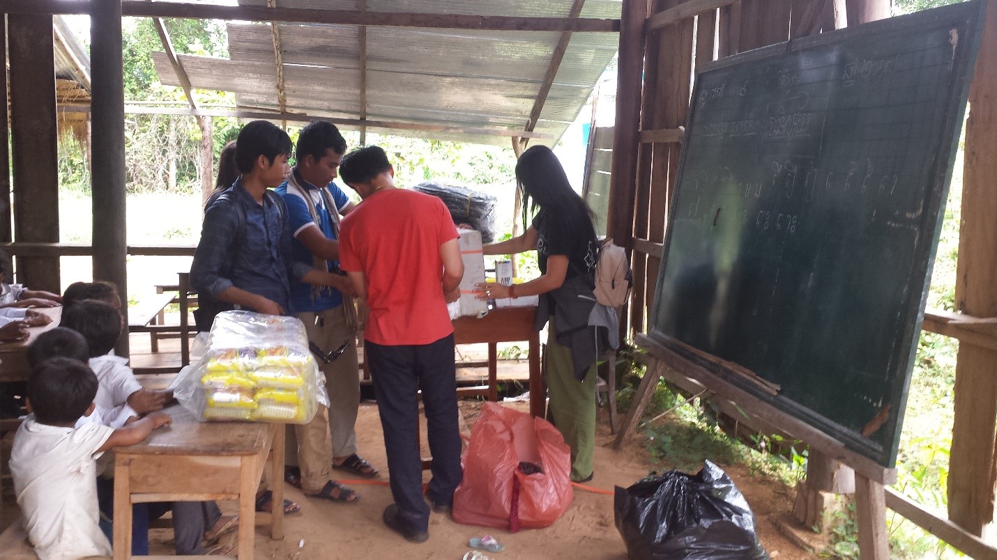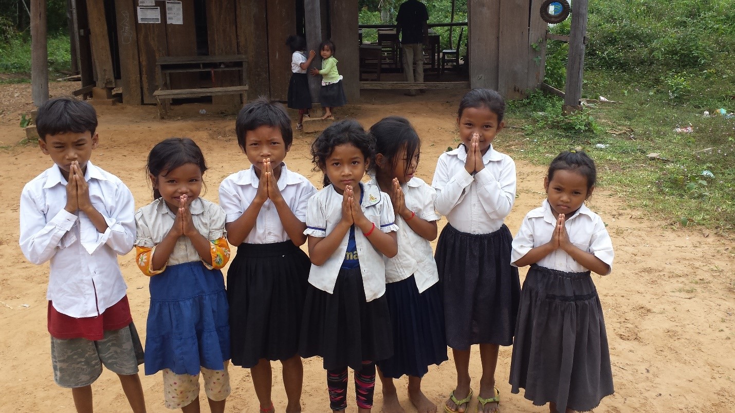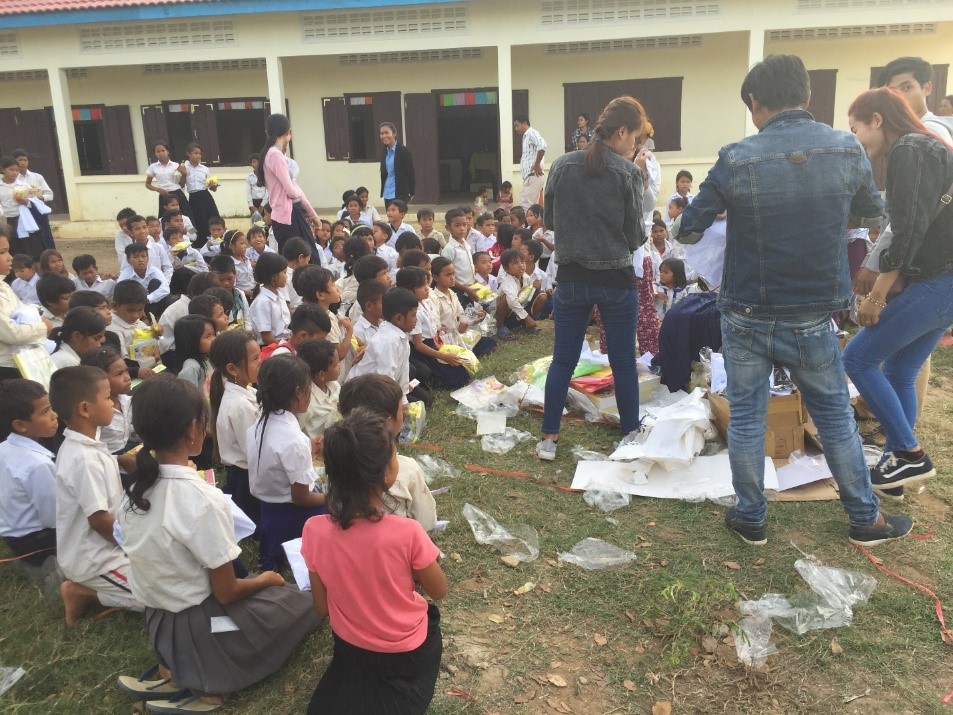 On November 17, 2017, the day after Setra’s engagement ceremony, we loaded up the car and drove about 2 hours to the middle of a rice paddy region to give poor school children some uniforms, books, folders, and even a snack package. The little community stood at a dirt crossroad, and the school consisted mostly of children whose parents had abandoned them to find work in Thailand. The local policeman was taking care of them to make sure they got to school each day.