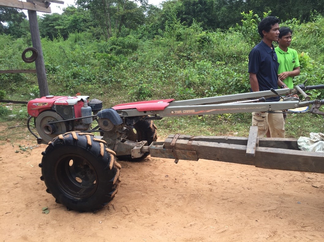 On the other side, I was given a ride on the back of the little motorcycle, but I was too busy holding on for dear life to get a picture of it. Brad rode the cart that was pulled by the tractor engine. I’m not sure what to call it, but such vehicles are used widely in Cambodia. Here is a picture of the front end and steering mechanism.