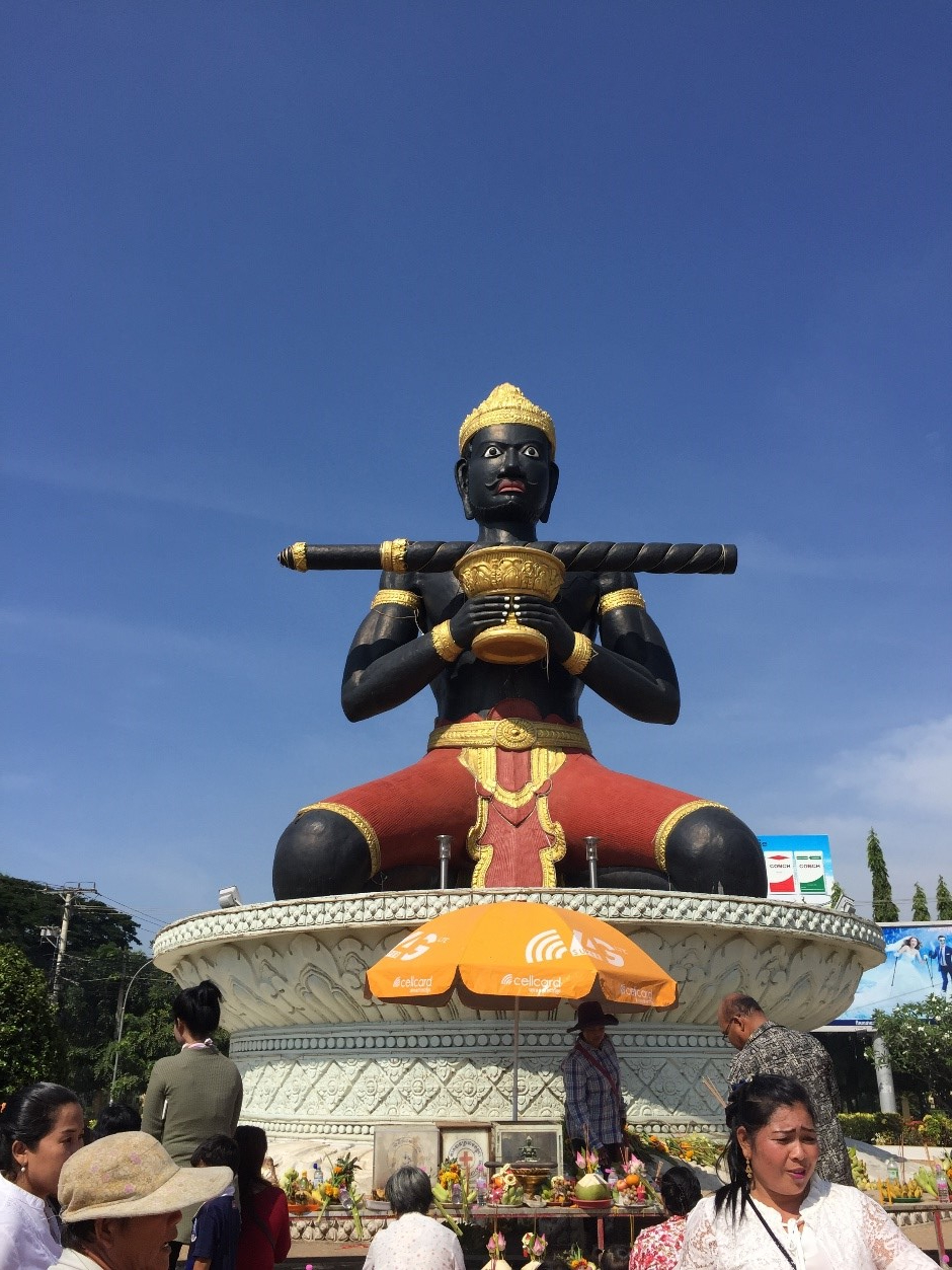 When we finished our work in Battambang and the surrounding areas, we checked out of the hotel and packed up the car. During our stay, we had noticed three large (giant) images in roundabouts in the town, where the Lord directed us to pray on behalf of the Cambodian people as a whole. The first represented a god of war on a horse.