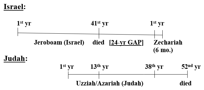 Jeroboam of Israel died in the 13th year of Uzziah of Judah. Then there was no king in Israel for 24 years, at which time his son Zechariah (not the prophet by the same name) became Israel’s king. Zechariah was enthroned in the 38th year of Azariah/Uzziah (2 Kings 15:8).