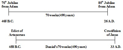 This 40-year period follows the 70th week of Daniel, which extended from 26-33 A.D. The 70 “weeks” (i.e., Sabbatical cycles of 7 years each) began with the Edict of Artaxerxes I of Persia in the Spring of 458 B.C. Because his Edict came 7 years after the 70th Jubilee from Adam (465 B.C.), the end of the 70 weeks was also 7 years past the 80th Jubilee (26 A.D.).