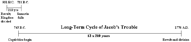 Having established that "the time of Jacob's trouble" refers to two 21-year times in Jacob's life and two 210-year cycles in the national fulfillment, we go now to thelong-term prophetic fulfillment of this time that brings us up to modern history. This long-term cycle extends 12 x 210 years, for a total of 2,520 years.
