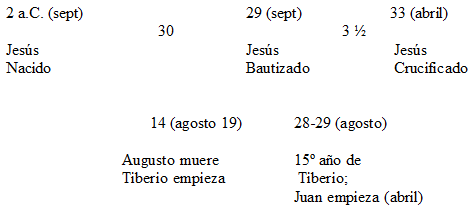 Así, podemos concluir primero que Jesús nació cuando Cirenio era gobernador del lugarteniente de Siria en 2 a.C.; en segundo lugar, que Juan empezó su ministerio en la Pascua de 29 d.C. en el 15º año de Tiberio; en tercer lugar, que Jesús fue bautizado a septiembre del año 29 y finalmente que El fue crucificado en el año 33. Esto es crucial para entender las 70 semanas de Daniel.