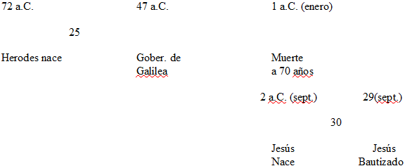 Historiadores saben también que Herodes tenía 25 años cuando comenzó su carrera in 47 a.C., cuando su padre lo nombró gobernador de Galilea (Antigüedades de los Judíos, XIV, ix, 2). Así, Herodes estaba en su 70º año desde 2 a.C. hasta su muerte en enero de 1 a.C. Jesús nació aproximadamente cuatro meses más temprano en Rosh Hoshaná, el 29 de septiembre de 2 a.C.