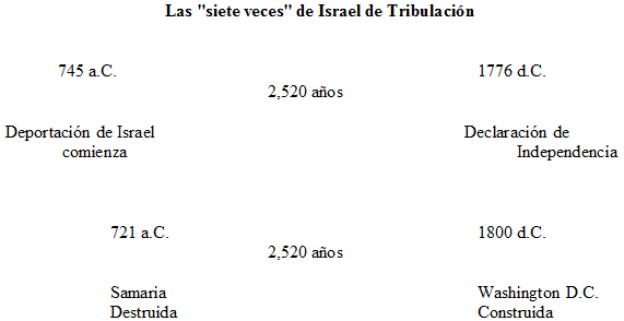 La conexión entre Israel y América generalmente no se conoce, porque la mayoría de las personas han sido enseñadas que los judíos son Israel. Pero los ciclos de tiempo no mienten. Tiempo es el gran conector y establece más verdad que la gente comprende. La dispersión de Israel en Asiria empezó a terminarse con la declaración de independencia en América donde las llamadas "tribus perdidas" empezaron a ser una vez más reunidas. Secundariamente, de la destrucción de la ciudad capitaleña de Israel (Samaria) a la construcción de la capital de América (Washington D.C.) también eran 2,520 años.