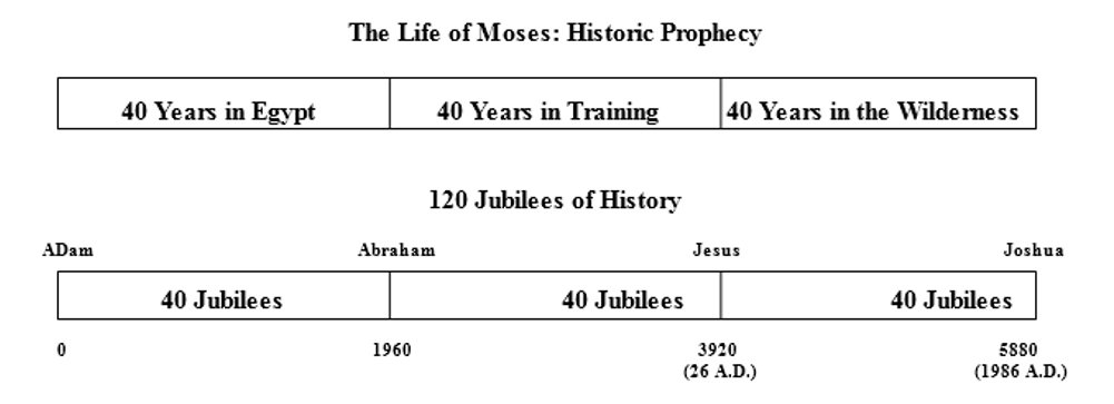 Así como Moisés guió "la iglesia en el desierto" (Hechos 7:38) durante 40 años, también Jesús condujo a la Iglesia del Nuevo Testamento al desierto durante un período de 40 jubileos. Moisés murió después de dirigir Israel durante 40 años, y Josué guió a Israel a través del río Jordán hacia la Tierra Prometida. Así también en nuestros días, después de 40 Jubileos más, Jesús (cuyo nombre hebreo es Josué) nos llevará a la mayor promesa de la herencia perdida por Adán al principio.